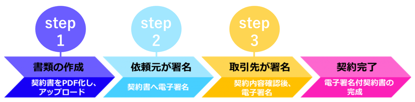 まず、契約書をシムワークにアップロードします。次に、依頼元と取引先の双方で電子署名を行うだけで、簡単に手続きを完了できます。このプロセスは、シンプルな3ステップで進められ、時間を大幅に節約できます。さらに、取引先がシムワークをまだ導入していない場合でも、契約書の内容を確認し、電子署名や押印を行うことができるため、円滑な契約締結が可能です。